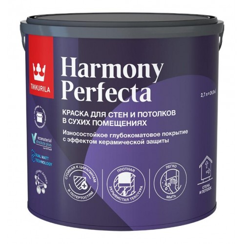 Краска создает поверхность, особо стойкую к механическим воздействиям. Керамические микросферы в составе усиливают механическую прочность окрашенной поверхности. В сочетании с уникальным набором функциональных наполнителей покрытие Tikkurila Harmony Perfecta способно восстановить внешний вид поверхности после бережной обработки стен сухой или увлажненной тканью и обеспечить поверхность без глянцевых затертостей.