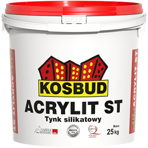 Силикатная штукатурка KOSBUD ACRYLIT-SТ предназначена для выполнения декоративных тонкослойных штукатурных покрытий внутри и снаружи зданий а также в системах теплоизоляции KOSBUD. Доступна в базовом белом цвете и колерованная в массе согласно палитре цветов KOSBUD СOLOR SYSTEM. Высокоэластичная, высокопаропроницаемая, стойкая к ударам и царапинам, долговечная, стойкая к ультрафиолетовому излучению, множественным загрязнениям, промышленной загазованности и развитию микроорганизмов, с повышенной гидрофобностью, способна самоочищаться. Удобная и легкая в нанесении и структурировании. Экологически безопасна.